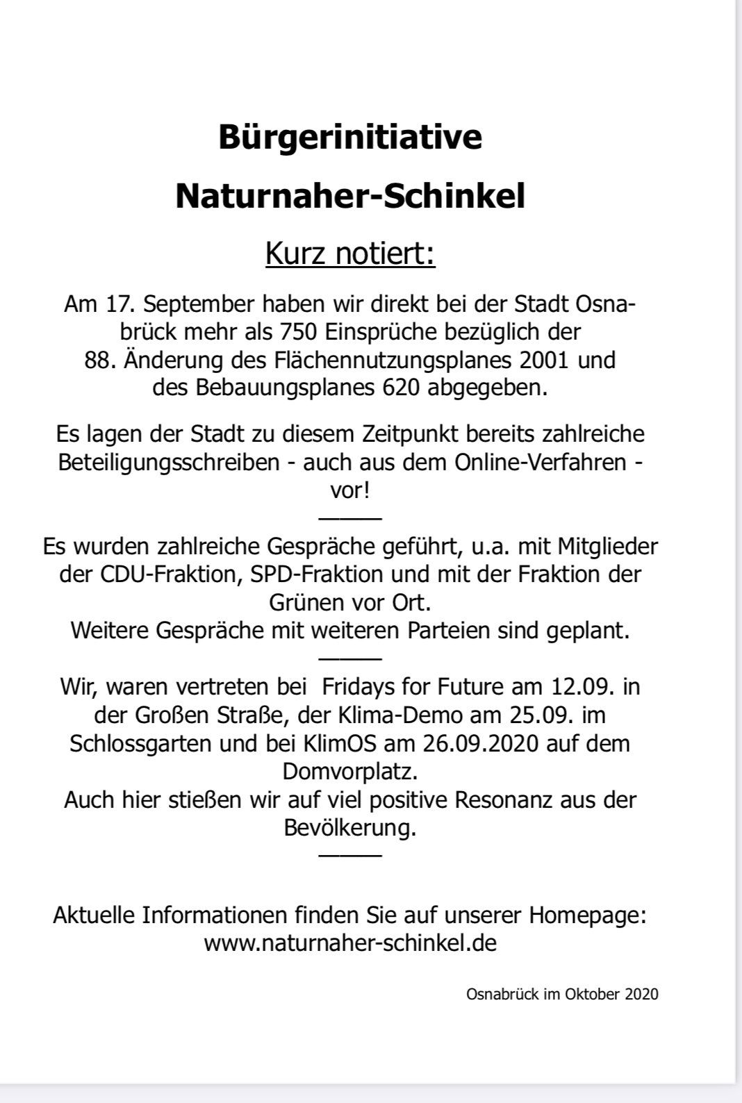 Unabhängig davon wird die Initiative weiterhin die Bürger auf ihrer Internet-Seite (naturnaher-schinkel.de), mit Flugblättern und bei öffentlichen Veranstaltungen über ihre Aktivitäten informieren und um Unterstützung nicht nur in den Stadtteilen Schinkel und Schinkel-Ost werben. Im Gespräch sind die Initiatoren zudem mit Fraktionen und Ratsmitgliedern der Parteien.
