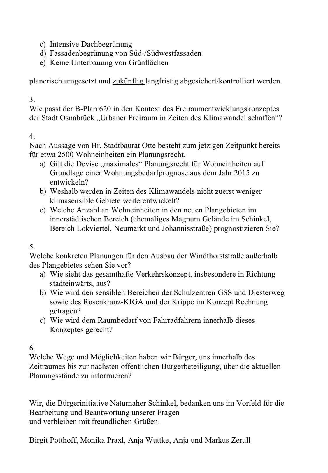 Die Bürgerinitiative wird kurzfristig der Verwaltung einen konkreten Fragenkatalog vorlegen zum weiteren Verlauf der Planung rund um das Baugebiet 620.